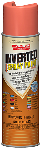 Champion Sprayon® Inverted Paint can be used for handheld applications (accurate marking 5” to 12” above the ground), or with a Champion Sprayon Long or Short Wand. Spray on asphalt, concrete or other paved surfaces, or on dirt, grass or gravel. Lasts 4-6 months, depending upon traffic and exposure.