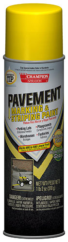 Champion Sprayon® Pavement Striping Paint is designed for striping asphalt, concrete or other paved surfaces. The discharge valve sprays only in a downward position. The universal tip fits all machines. Use it with a Champion Sprayon Paint Striper. Stripes 600-800 linear feet. Now toluene free; won't harm grass.
